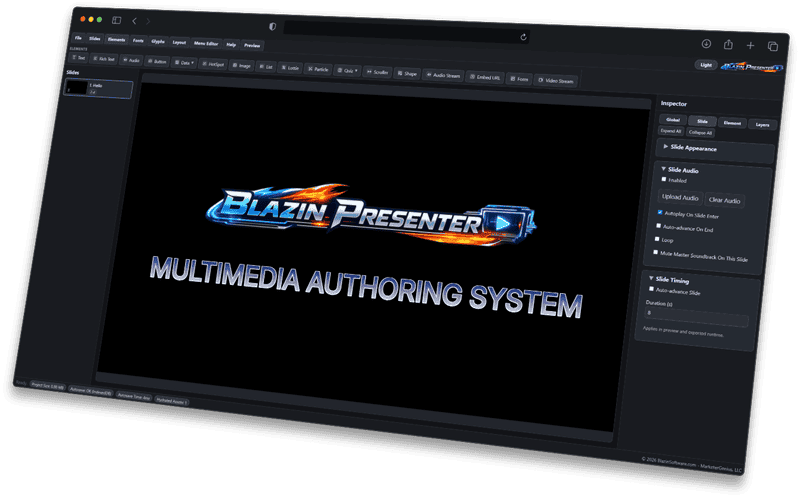 Blazin Presenter is a web-based visual authoring tool for building multimedia presentations, interactive lessons, quizzes, digital signage, WordPress-ready content, and SCORM packages for LMS platforms.